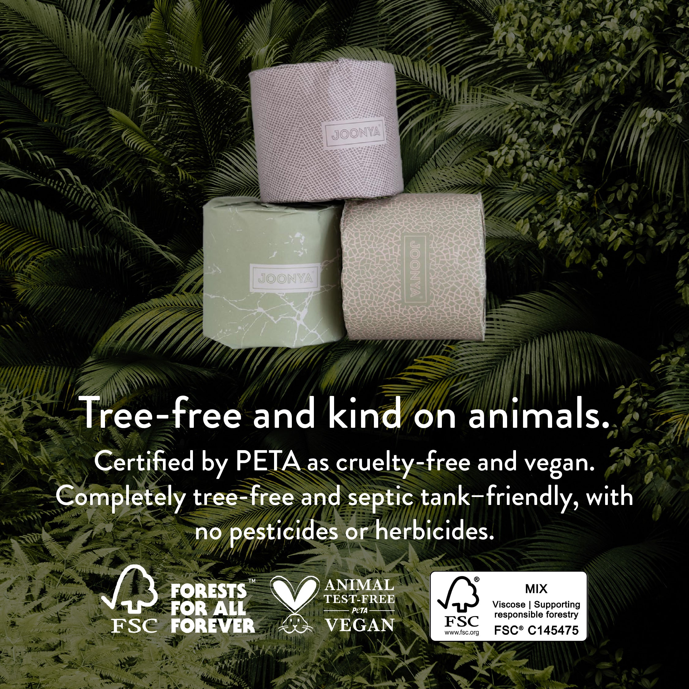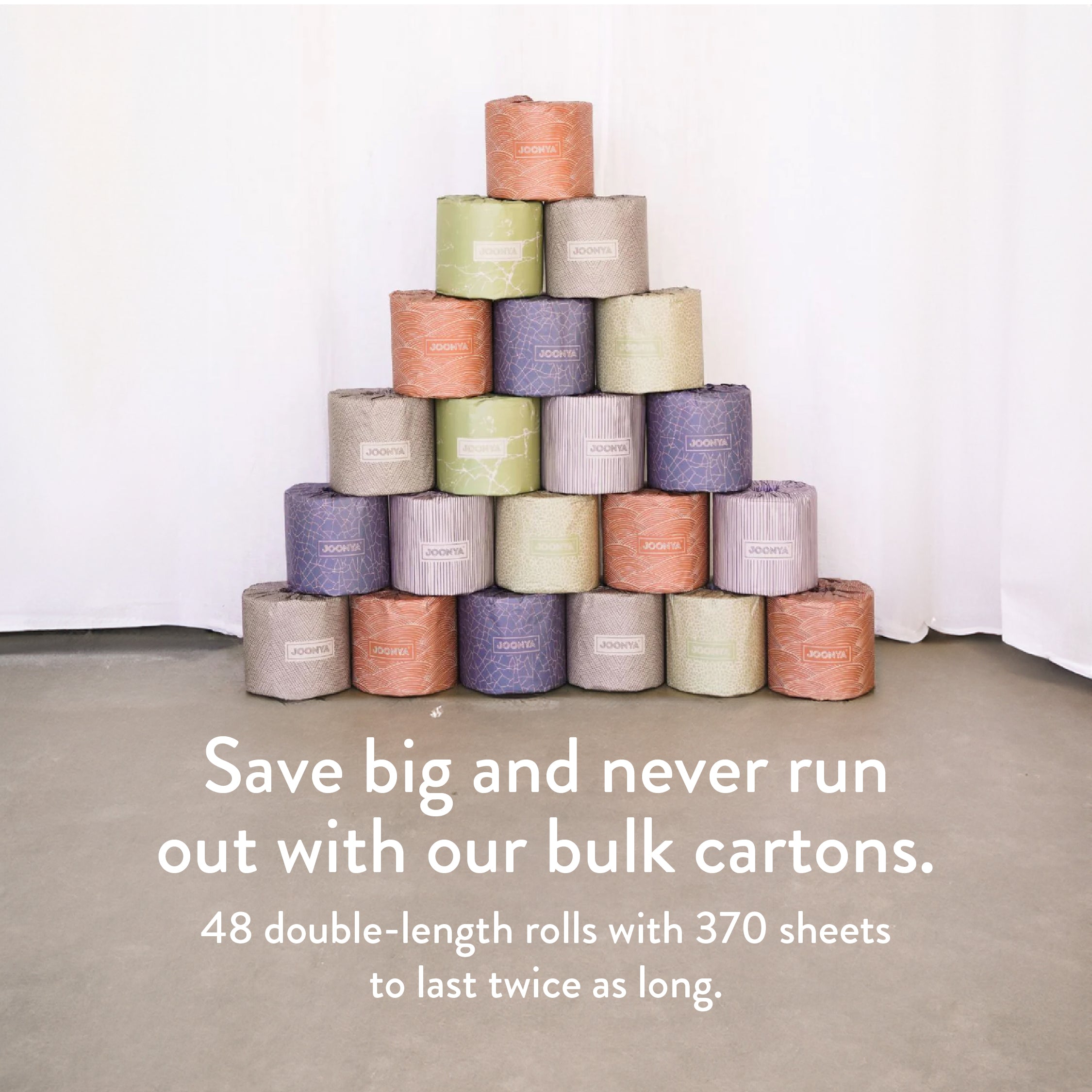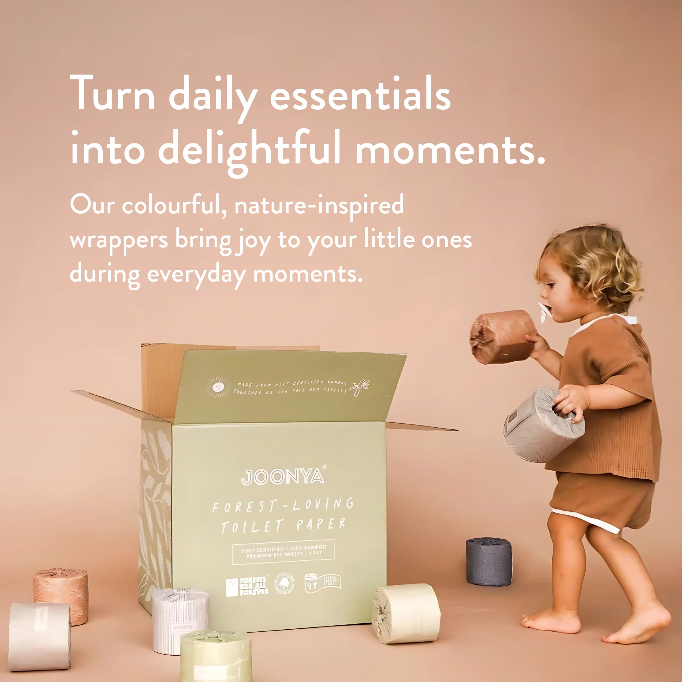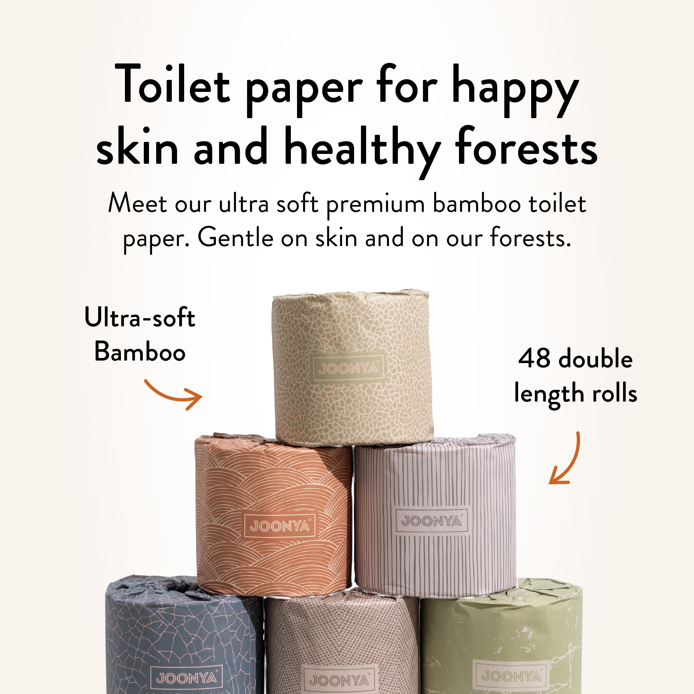Joonya’s forest-friendly bamboo toilet paper is as gentle on your family’s skin as it is on our world's forests. Our ultra strong toilet paper features double length rolls to last you twice as long, with 370 soft 3ply 10x10cm sheets. Available in 6 stunning eco-luxe biodegradable wrappers, these aesthetic toilet rolls are designed to be showcased and will enhance any bathroom décor or colour palette.
