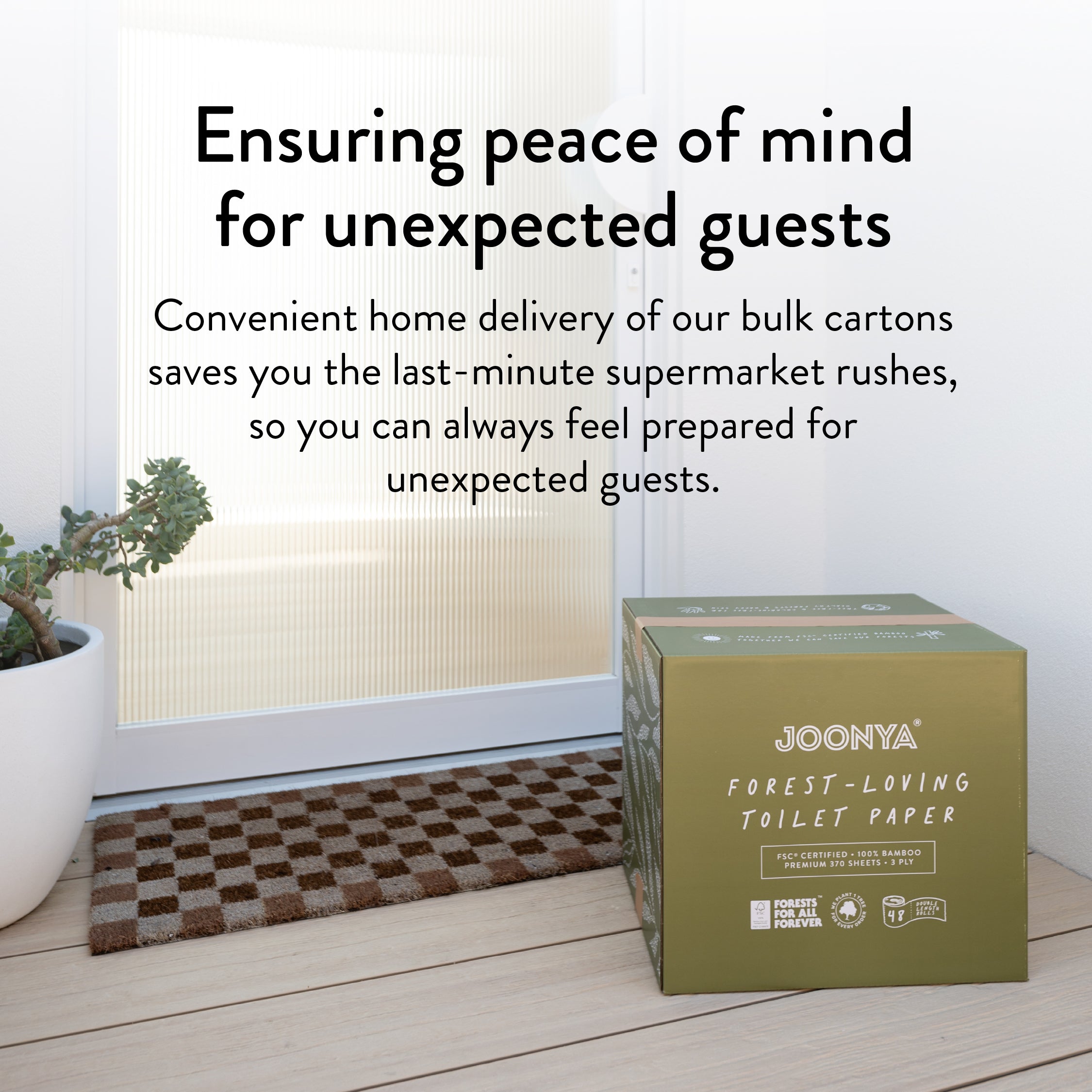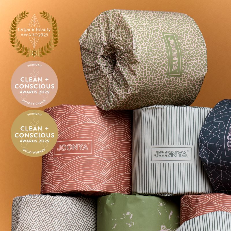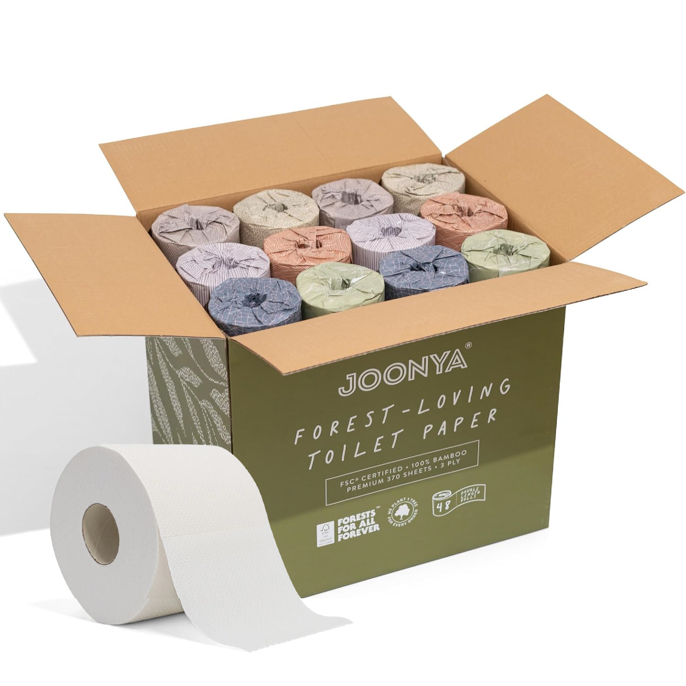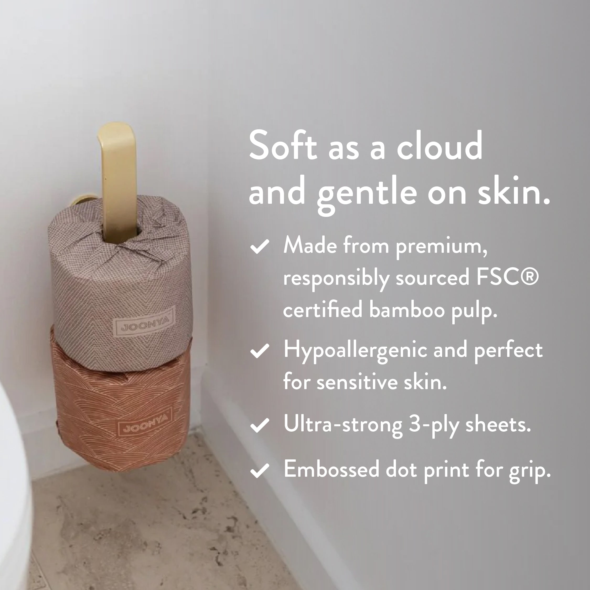 Joonya’s forest-friendly bamboo toilet paper is as gentle on your family’s skin as it is on our world's forests. Our ultra strong toilet paper features double length rolls to last you twice as long, with 370 soft 3ply 10x10cm sheets. Available in 6 stunning eco-luxe biodegradable wrappers, these aesthetic toilet rolls are designed to be showcased and will enhance any bathroom décor or colour palette.