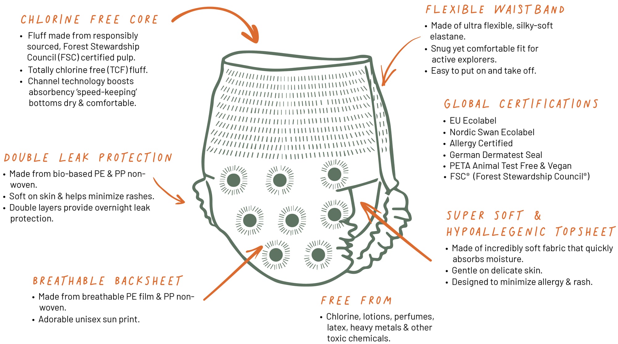 Totally free of chlorine, parabens, latex, phthalates, perfumes & heavy metals. Hypoallergenic materials make our subscription pull-ups ideal for sensitive skin. Reliable Danish manufacturer.